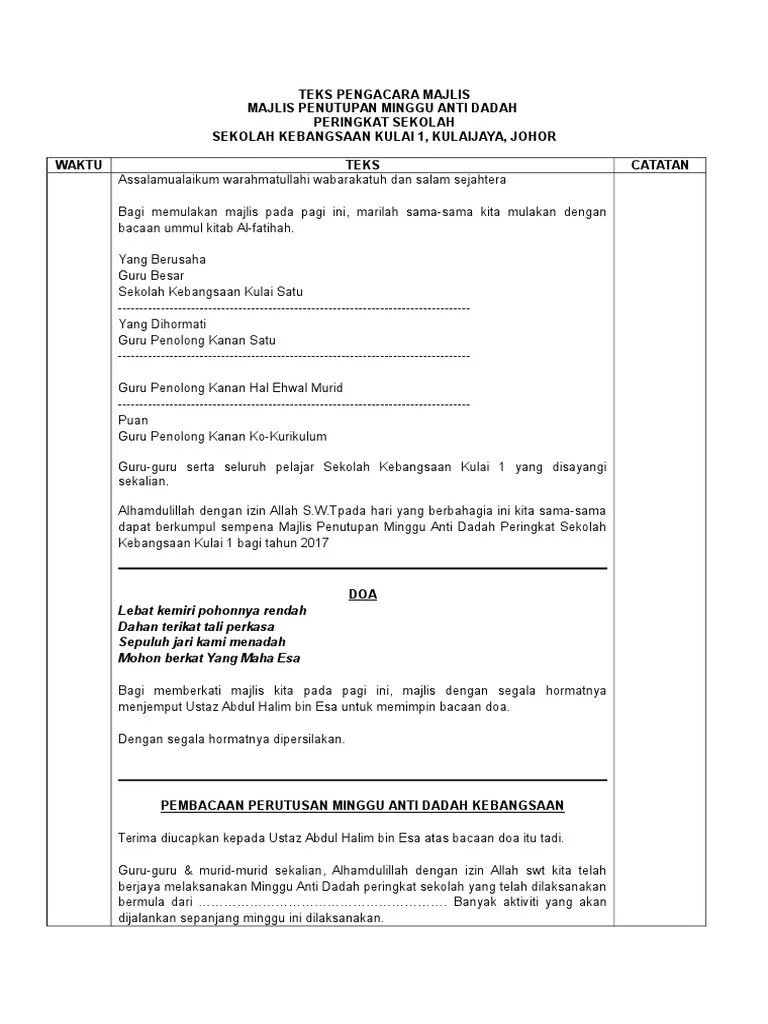 Dengan segala hormatnya majlis mempersilakan. Teks pengacara majlis pelancaran sumur dan sekolah penyayang tahun . Skrip mc program jom ke sekolah dan pelancaran peti aduan murid 2017full description. Teks pengacara majlis majlis penutupan minggu anti dadah peringkat sekolah sekolah kebangsaan kulai 1, kulaijaya, johor.